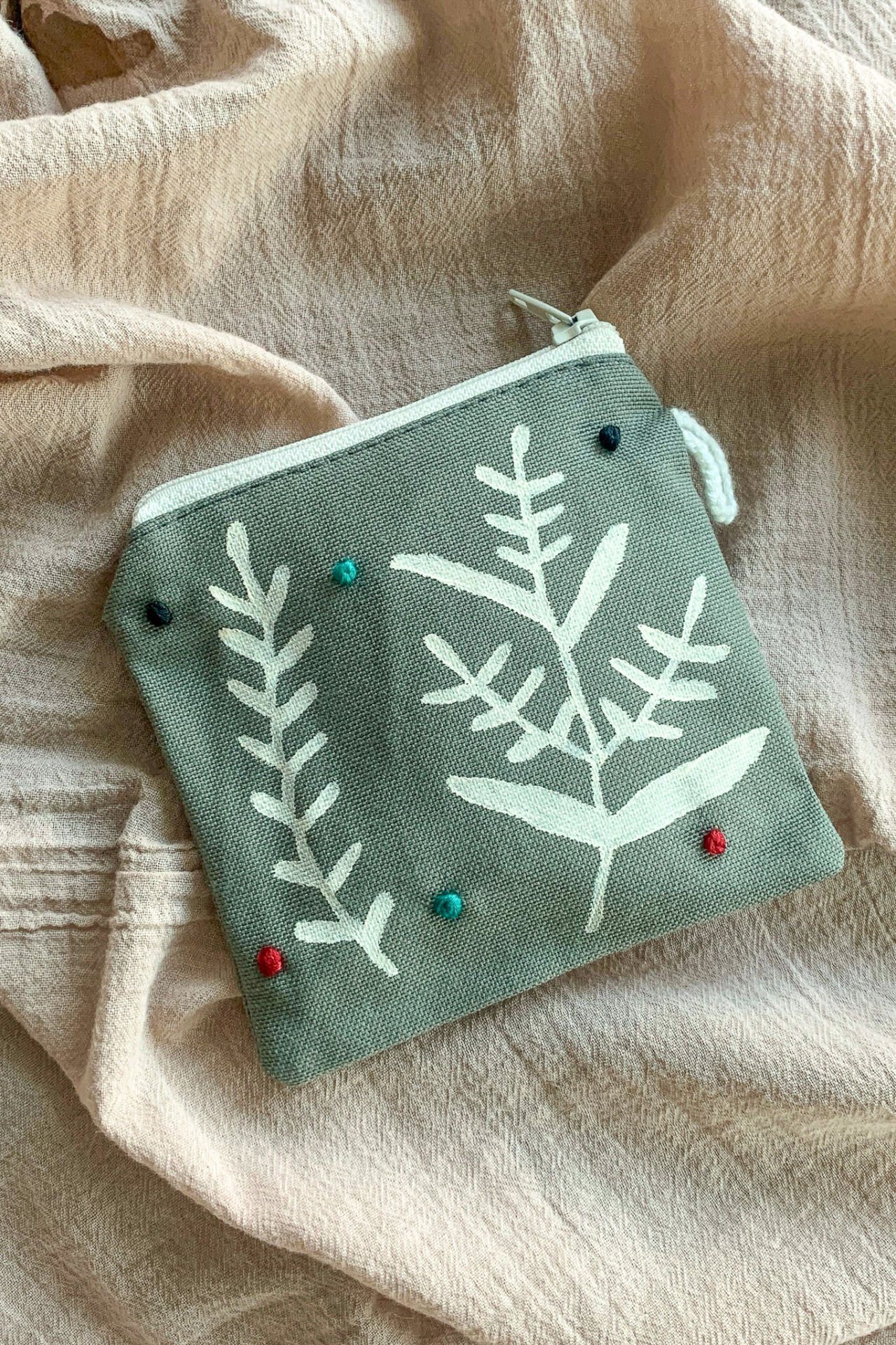 Gri Yapraklar Desenli İsim İşlemeli Mini Cüzdan