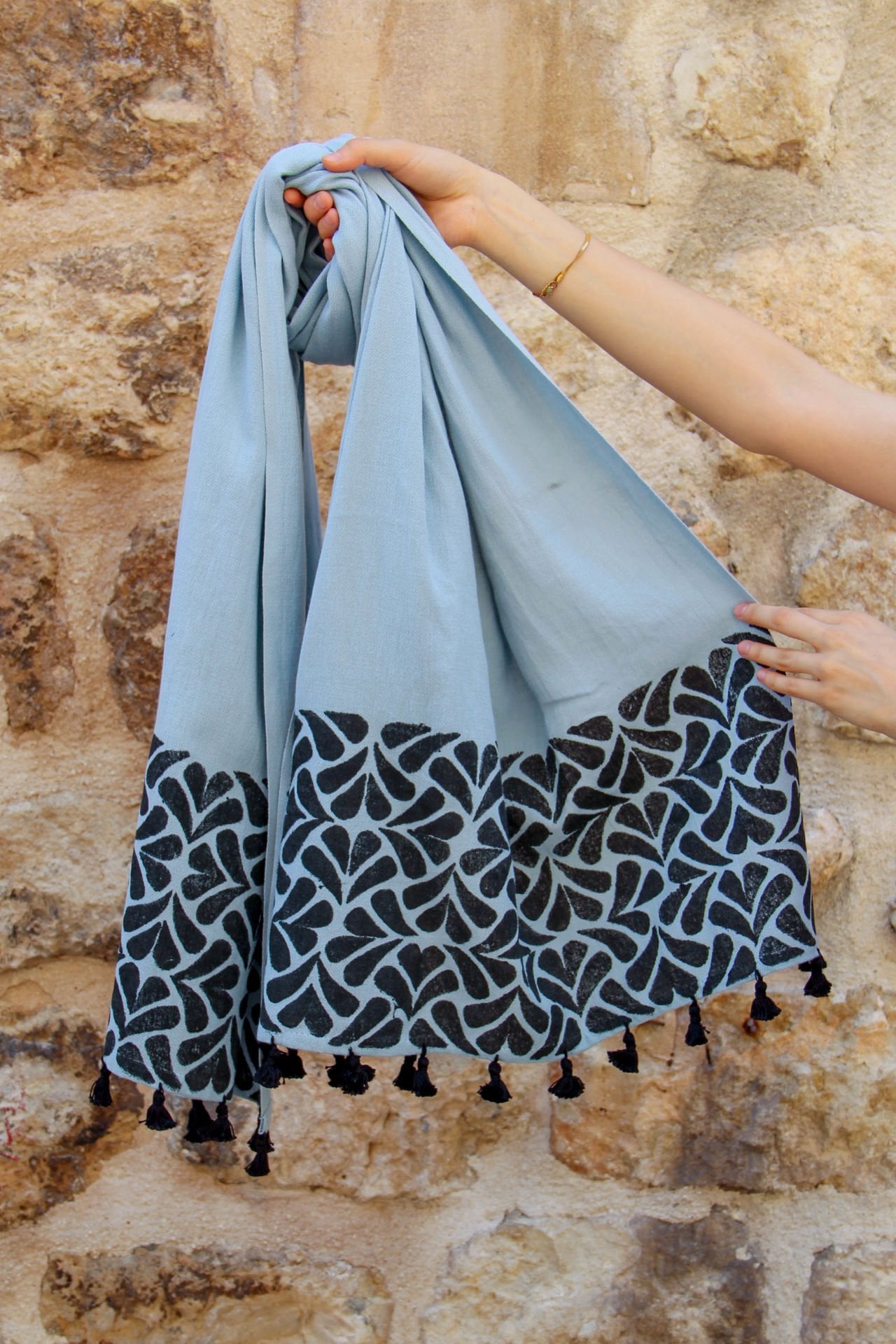 Üzerindeki desenler, Mardin Ahşap Baskı ve Doğal Boyama Atölyemizin kadın üreticileri tarafından ahşap baskı tekniği ile ıhlamur ağacından kalıplarla uygulanmıştır.