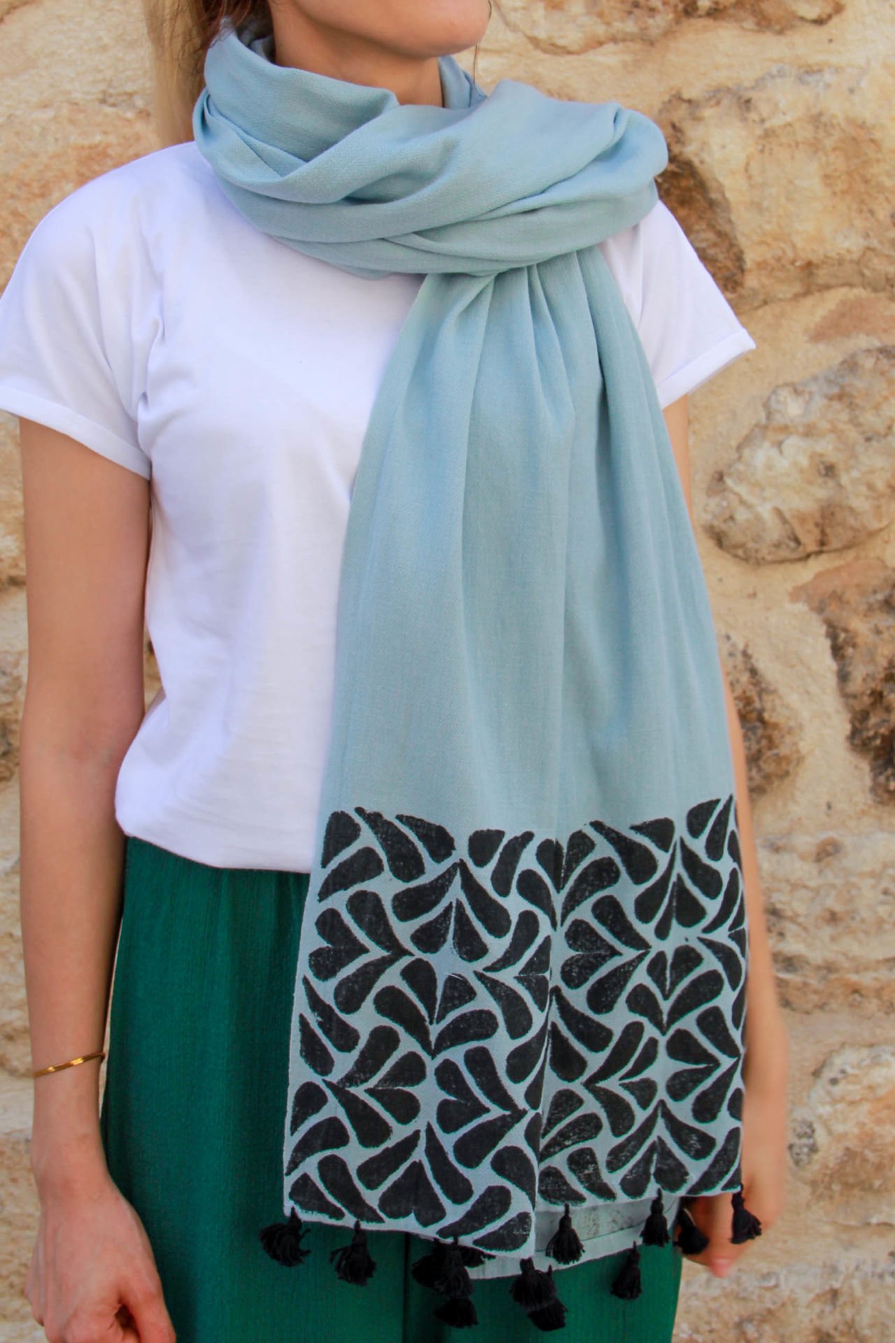%100 organik pamuk şalımız, kendinden bürümcüklü dokudadır. Kumaşı, Global Organik Tekstil Standartları belgesine uygun olarak, bitkilerden elde edilen organik boyalarla boyanmıştır.