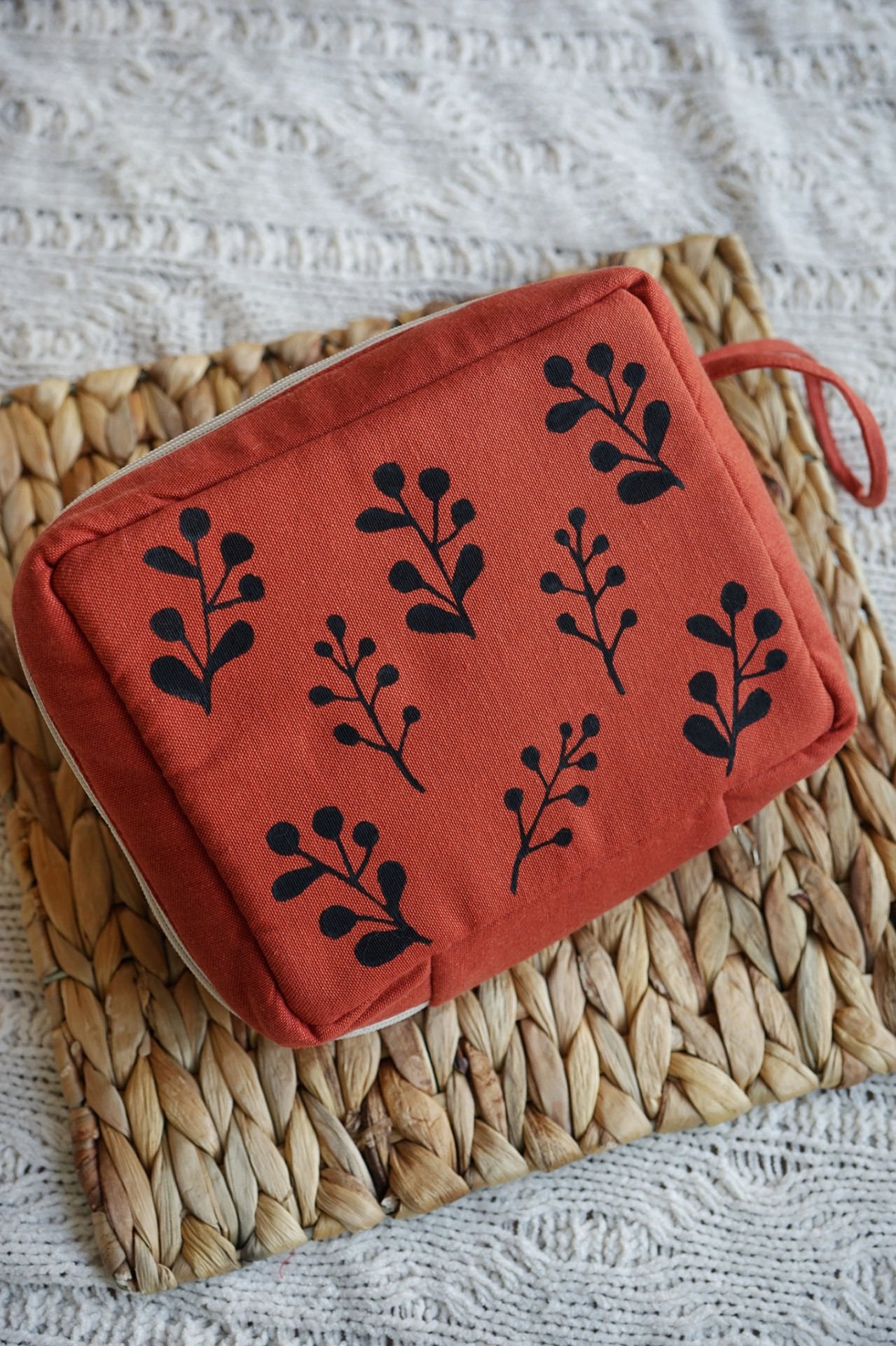Mardin Ahşap Baskı ve Doğal Boyama Atölyemizin üretici ve girişimci kadınları tarafından doğal ham maddelerden el yapımı olarak üretilmiştir. Üzerindeki desenler, Ahşap Baskı Tekniği ile uygulanmaktadır. Minik puantiyeler, tohum işi el nakışıdır.