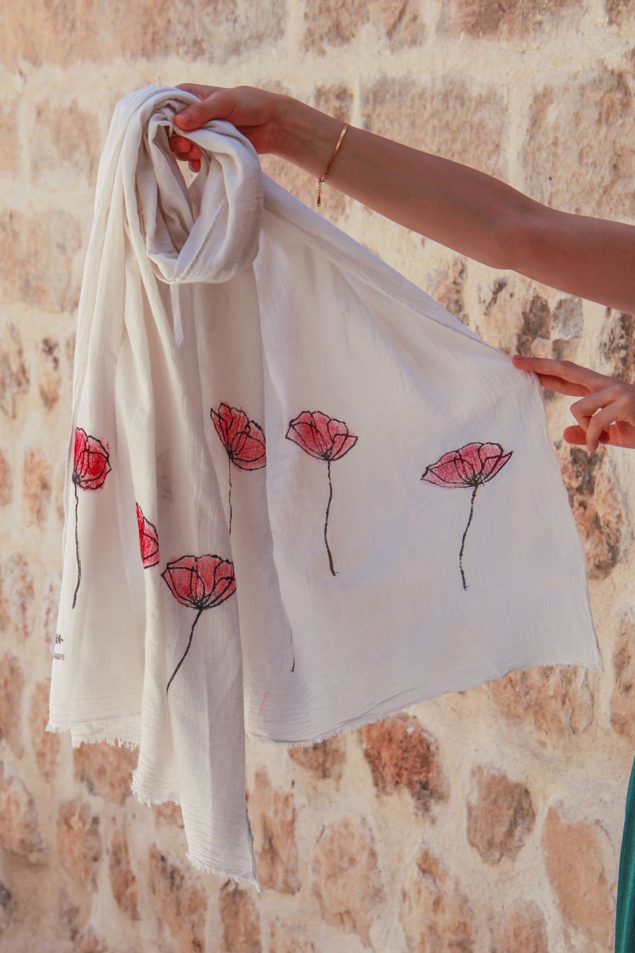 Kırmızı Gelincikler Desenli Organik Pamuk Şal