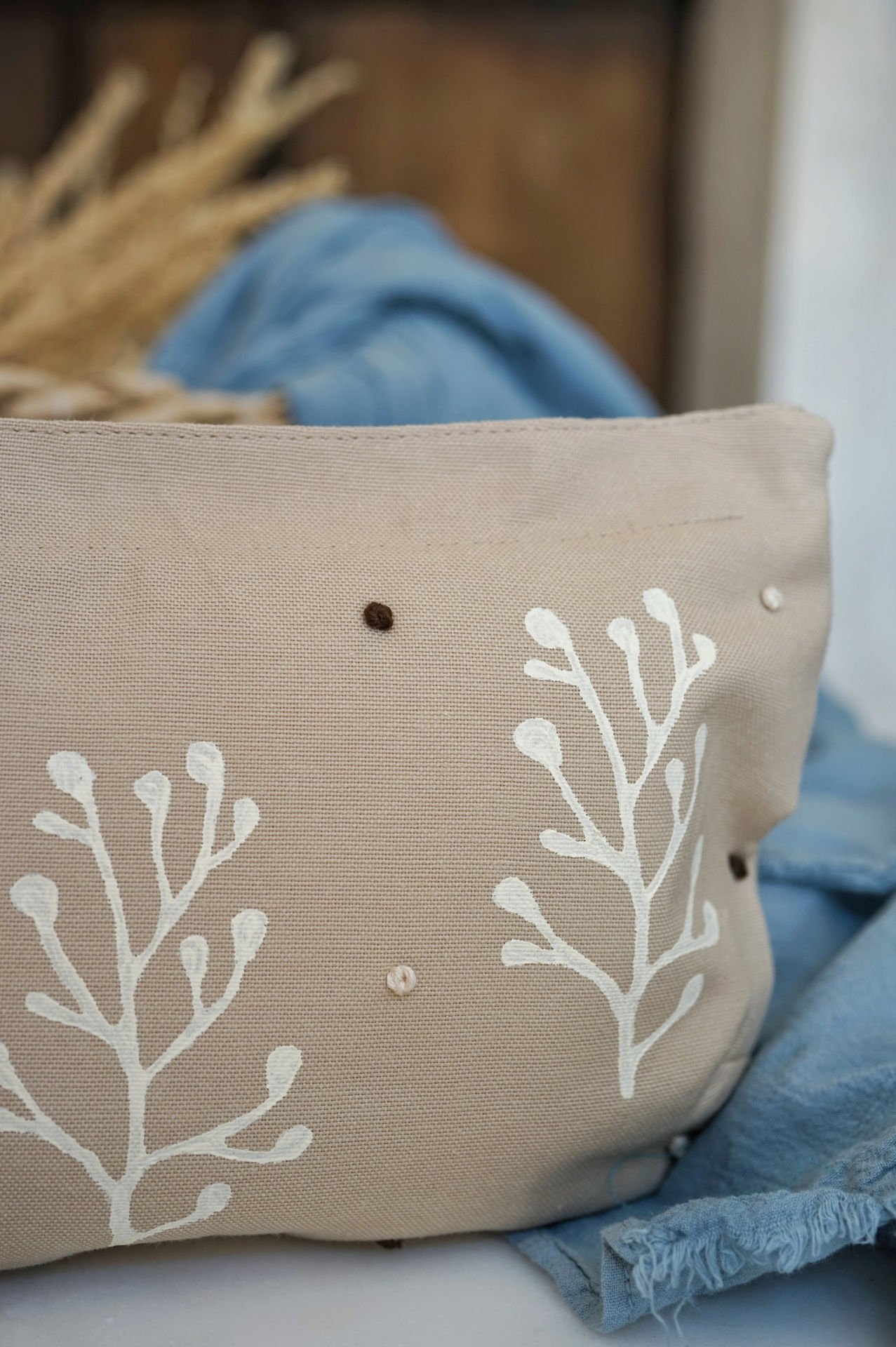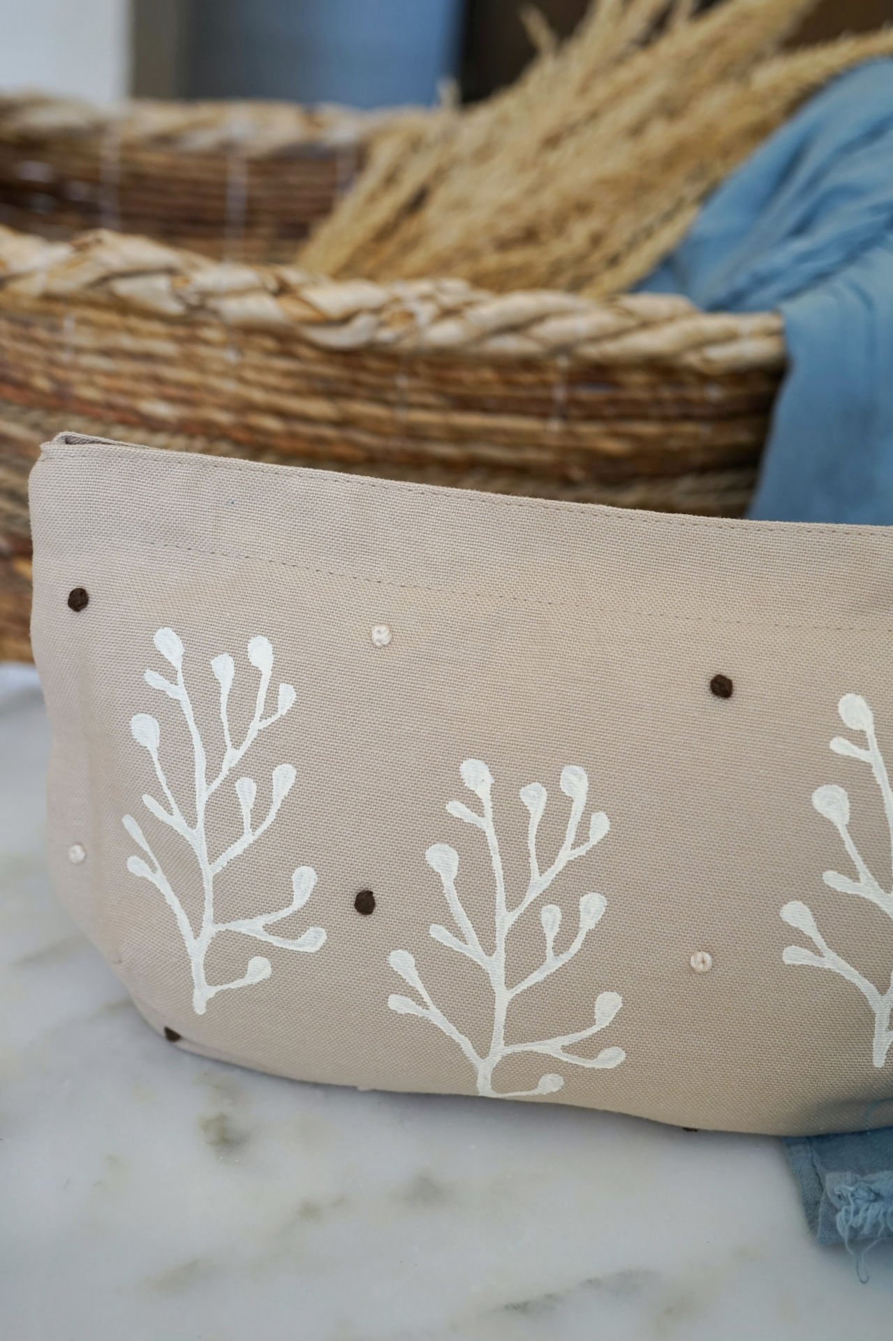 Ahşap baskı desenlere aynı zamanda el nakışı ile işlenmiş puantiye "tohum" nakışlar eşlik etmektedir.