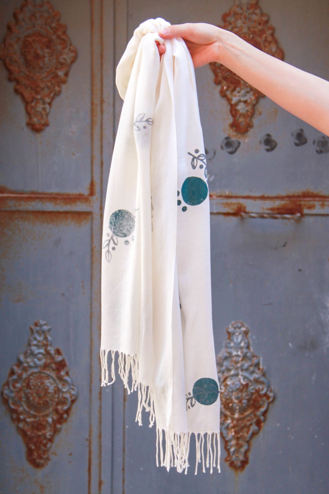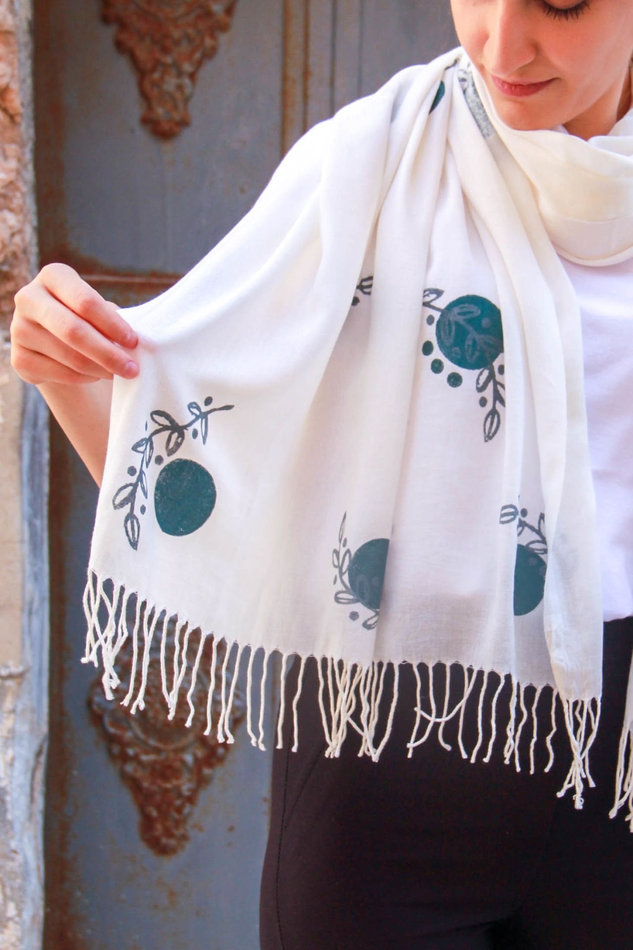 %100 organik pamuk şalımız, kendinden bürümcüklü dokudadır. Kumaşı, Global Organik Tekstil Standartları belgesine uygun olarak, bitkilerden elde edilen organik boyalarla boyanmıştır.