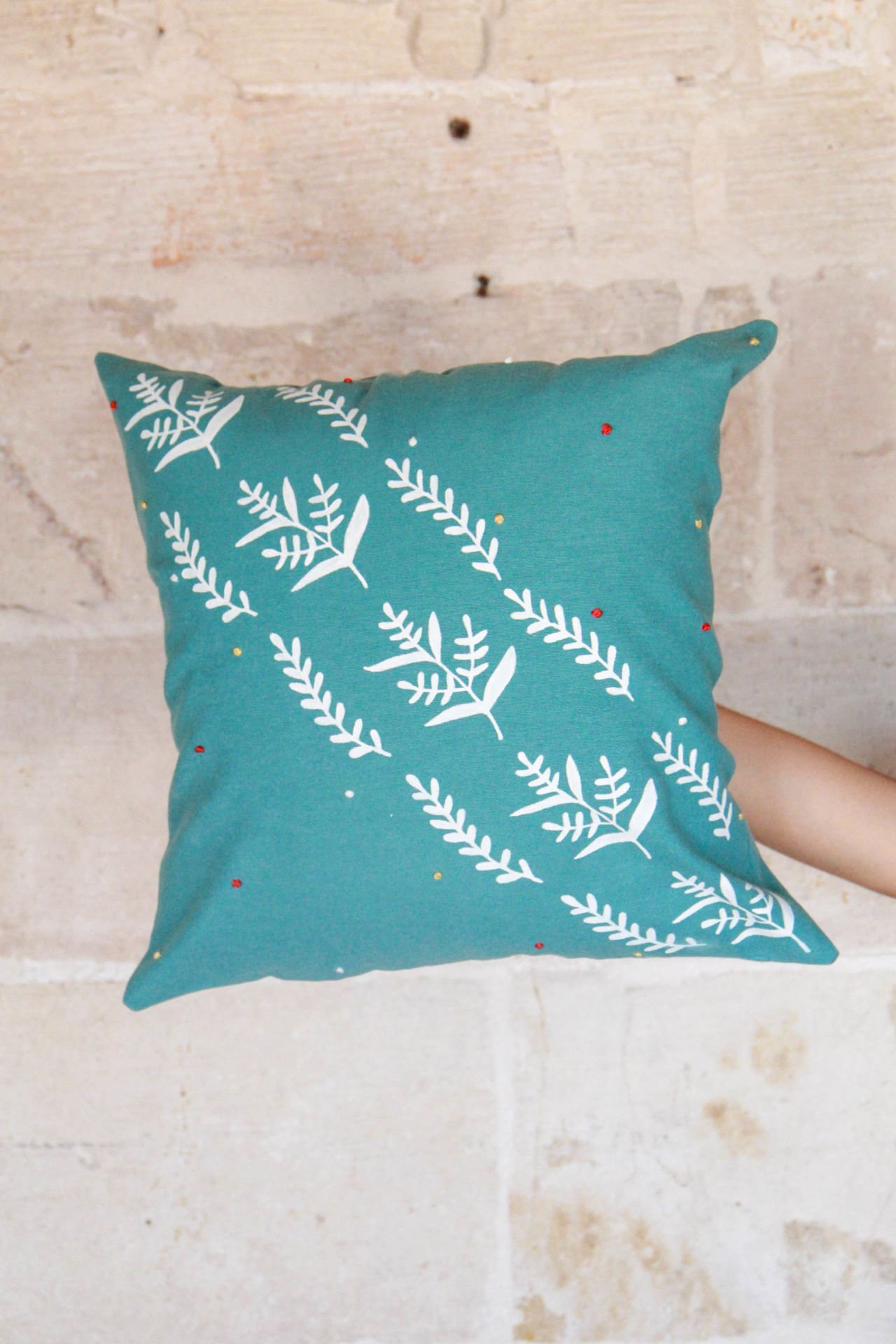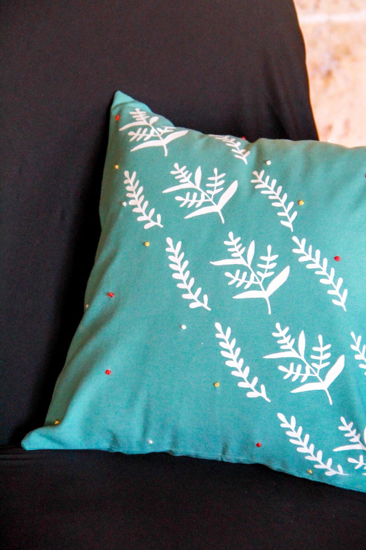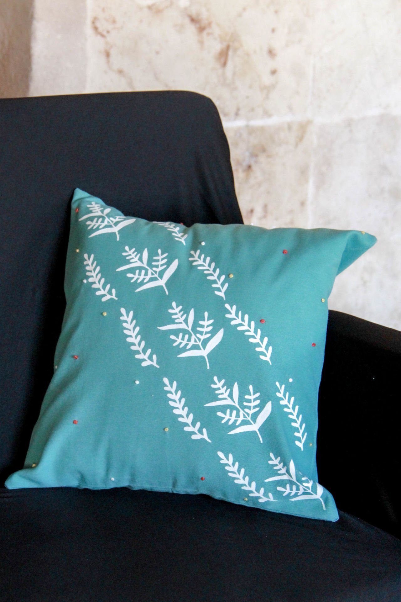 Turkuaz Üzeri Zeytin Yaprakları Desenli Kırlent Kılıfı 40x40 cm.